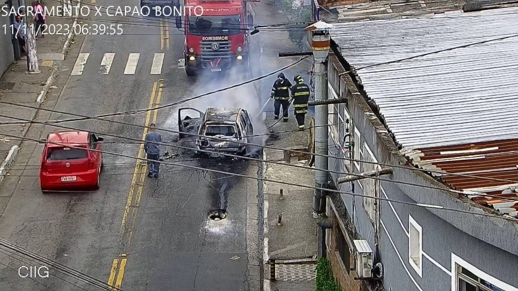 Um veículo da marca Ford, modelo Fiesta, foi consumido pelo fogo na manhã de sábado (11) na estrada do Capão Bonito, no Jardim Maria de Lourdes. O caso foi flagrado pelas câmeras da Central de Inteligência Integrada de Guarulhos, que acionou agentes da Secretaria de Transportes e Mobilidade Urbana (STMU) e do Corpo de Bombeiros.