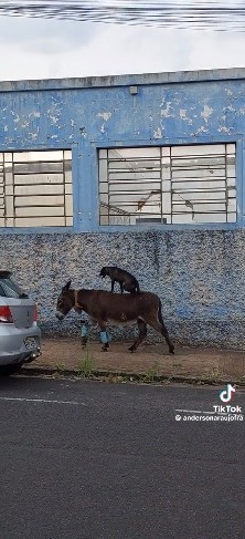 Se eu contar, ninguém acredita! Um vira-lata foi flagrado pegando uma “carona” no lombo de um burro em Birigui, interior de São Paulo. A filmagem em que o burro carrega confortavelmente o cachorro foi compartilhada nas redes sociais e viralizou surpreendendo os moradores do local que caíram em gargalhada ao entender a situação.
