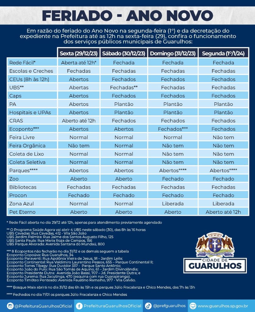 Em razão do feriado do Ano Novo na segunda-feira (1°) e do decreto que estabelece o expediente na Prefeitura até as 12h nesta sexta-feira (29), confira, acima, a tabela de funcionamento dos serviços públicos municipais de Guarulhos nesse período.