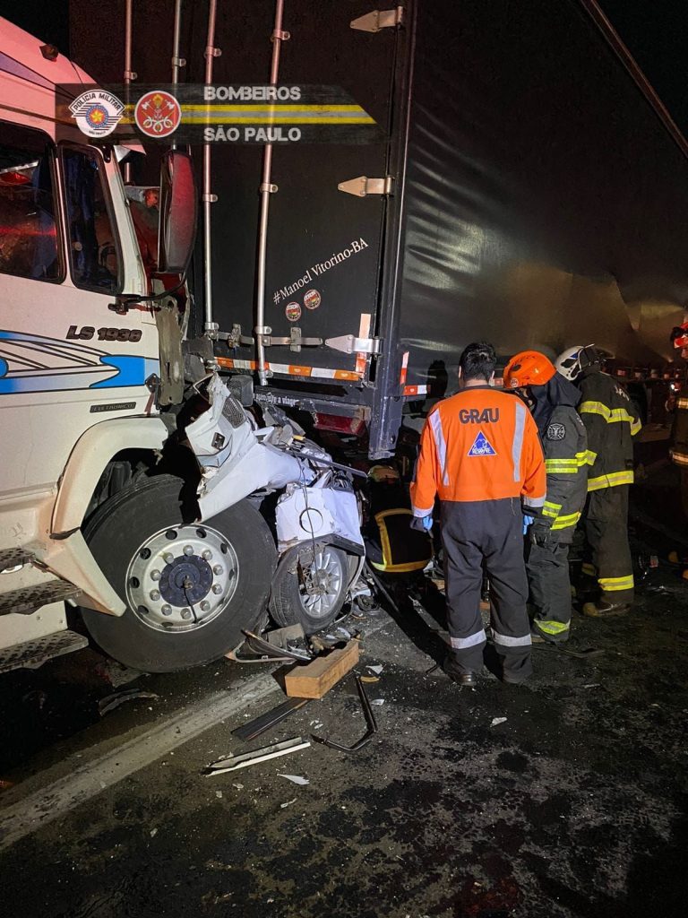 Nas imagens divulgadas pelos bombeiros, é possível ver o veículo de passeio prensado entre a parte dianteira da carreta que seguia por trás e a traseira da carreta que estava à frente. Os registros mostram que o carro ficou completamente destruído.
