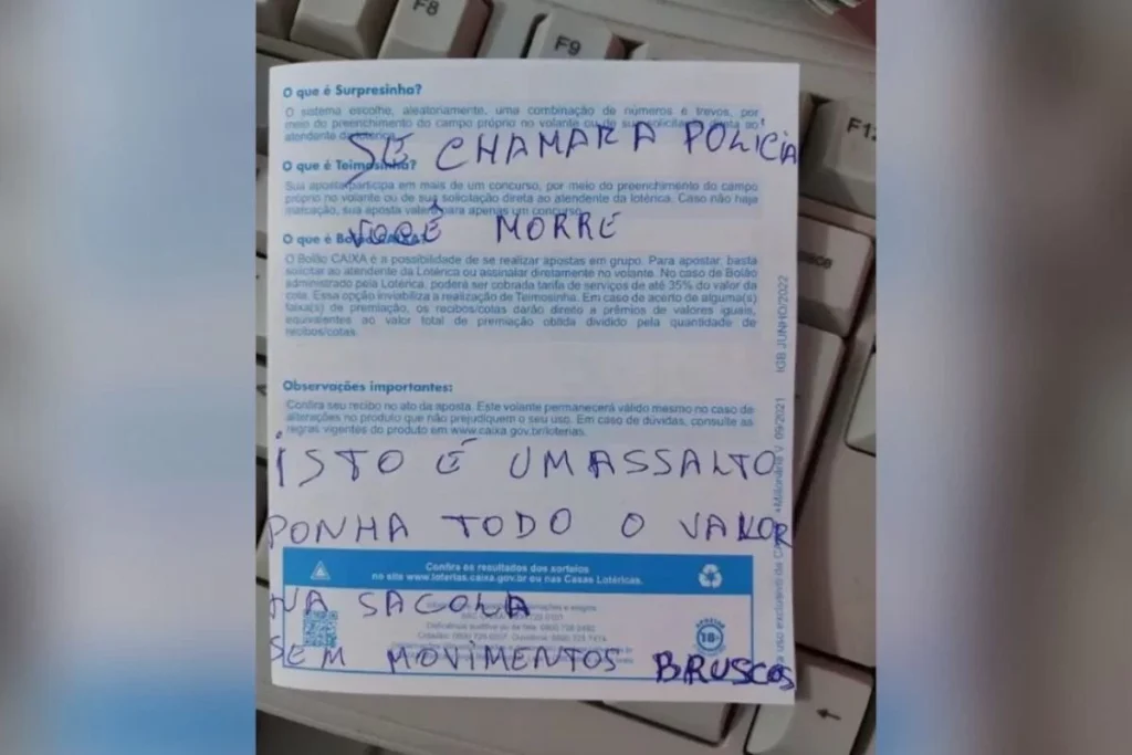 Uma lotérica, na Bahia, foi assaltada na última quarta-feira (17), de forma inusitada. Para anunciar o assalto, o criminoso improvisou um bilhete ameaçador no verso de um volante de jogo.