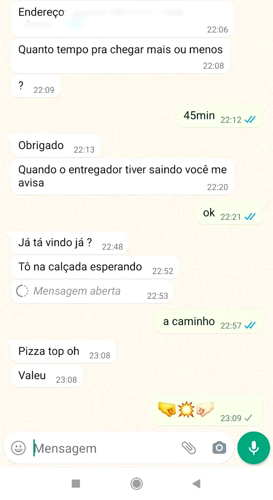 Na pizzaria, os pedidos podem ser feitos por meio do Whatsapp. A conversa que o estabelecimento teve com o cliente que queria dar o golpe aconteceu por volta das 22h. A pessoa questionou o tempo que levaria a entrega e ainda pediu para que o avisassem quando o entregador estivesse saindo.