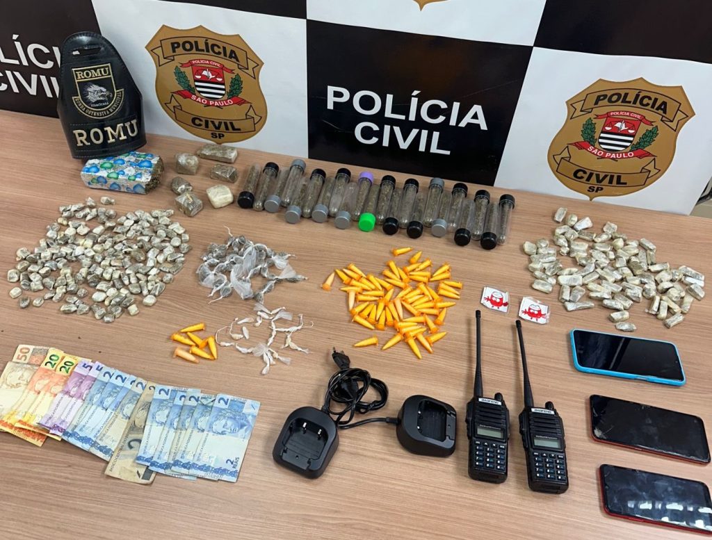 Cinco homens, com idades entre 20 e 30 anos, foram presos por tráfico de drogas nesta quinta-feira (11), no bairro Monte Líbano, em Piracicaba. Três deles foram beneficiados pela saída temporária em março e não retornaram ao presídio. Com o bando foram encontradas quase 400 porções de drogas. Policiais civis da 2ª Delegacia de Investigações sobre Entorpecentes da Divisão Especializada de Investigações Criminais (Deic), com apoio da Guarda Civil Municipal, cumpriram mandado de busca e apreensão na casa de um homem suspeito de tráfico de drogas na região. No imóvel foram encontradas 74 porções de maconha, porém o suspeito não estava no local. Os agentes foram informados que ele estava em outro endereço. Ao chegar lá, conseguiram deter o alvo em flagrante. Durante as investigações, os policiais descobriram que o suspeito e outros comparsas usavam um barraco, na Comunidade Pantanal, para embalar, fracionar e armazenar drogas, além de abrigar foragidos da Justiça. No local, quatro homens foram encontrados e presos. Três deles eram foragidos. Com o bando foram localizadas mochilas com entorpecentes, além de drogas escondidas em um buraco de colchão. Ao todo, foram apreendidas 254 porções de maconha, 66 porções de cocaína, 21 porções de crack e 39 porções de maconha. Também foram encontrados três celulares e dois rádios comunicadores com carregadores. Os cinco homens foram presos, permanecendo à disposição da Justiça. O caso foi registrado como cumprimento de mandado de busca e apreensão, tráfico de drogas, captura de procurado, associação criminosa e associação para o tráfico na 2ª Dise de Piracicaba.