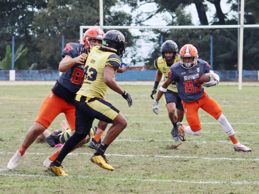 Um domingo histórico e emocionante no esporte guarulhense. No último lance, o Guarulhos Rhynos anotou um field goal (chute entre as traves que vale três pontos) e venceu na cidade de Taubaté o Rio Preto Weilers, de virada, por 10 a 7, pela São Paulo Football League. Com o resultado, os guarulhenses se classificaram à semifinal da competição de futebol americano.