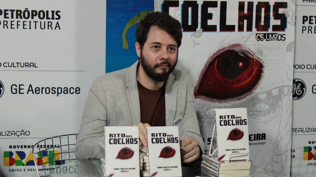 Tiago Santos-Vieira foi colaborador das revistas Rolling Stone, Trip/TPM, Riders e editor no Diário de Guarulhos. Ele já lançou também dois livros de suspense (Dança das Bestas e Elos do Mau Agouro). “Com minhas obras anteriores, fui convidado para eventos literários em Brasília, Minas Gerais, São Paulo… Inclusive, Dança das Bestas foi lançado na Horror Expo – Feira Internacional de Terror (SP). Já Elos do Mau Agouro, rendeu até um curta-metragem. Fora isso, tive uma interessante história no jornalismo, publicando nas principais revistas de entretenimento do país. E lancei também um livrinho infantil, intitulado As Aventuras do Super Careca. No momento, além de estar envolvido com a divulgação de Rito dos Coelhos, tenho publicado regularmente no blog da marca de camisetas Chico Rei”, disse.