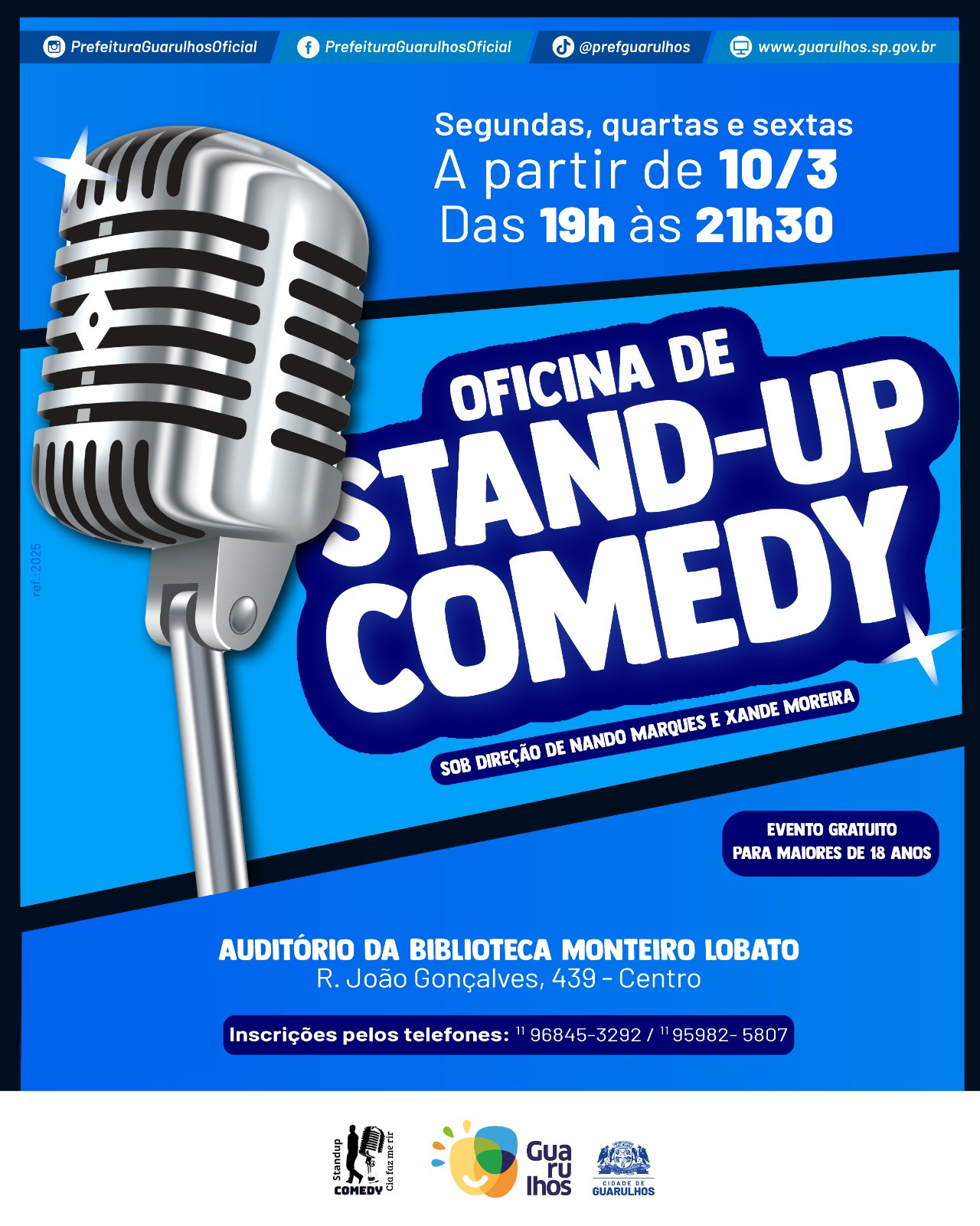 Com apoio da Secretaria de Cultura, a oficina conduzida pelos comediantes Nando Marques e Xande Moreira propõe uma jornada de autoconhecimento e performance para melhorar sua apresentação criativa e corporal, e com isso obter mais segurança para falar em público de maneira descontraída e espontânea, como é a característica desse tipo de apresentação cômica.