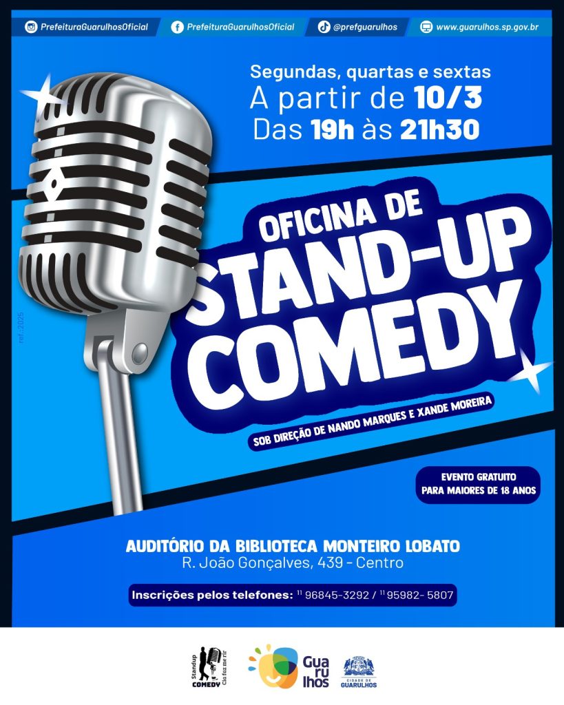 A partir do dia 10 de março a comédia tem espaço garantido no auditório Pedro Dias Gonçalves, na Biblioteca Monteiro Lobato: vai ter início a oficina de stand-up comedy produzida pela Companhia de Arte Faz-me Rir.