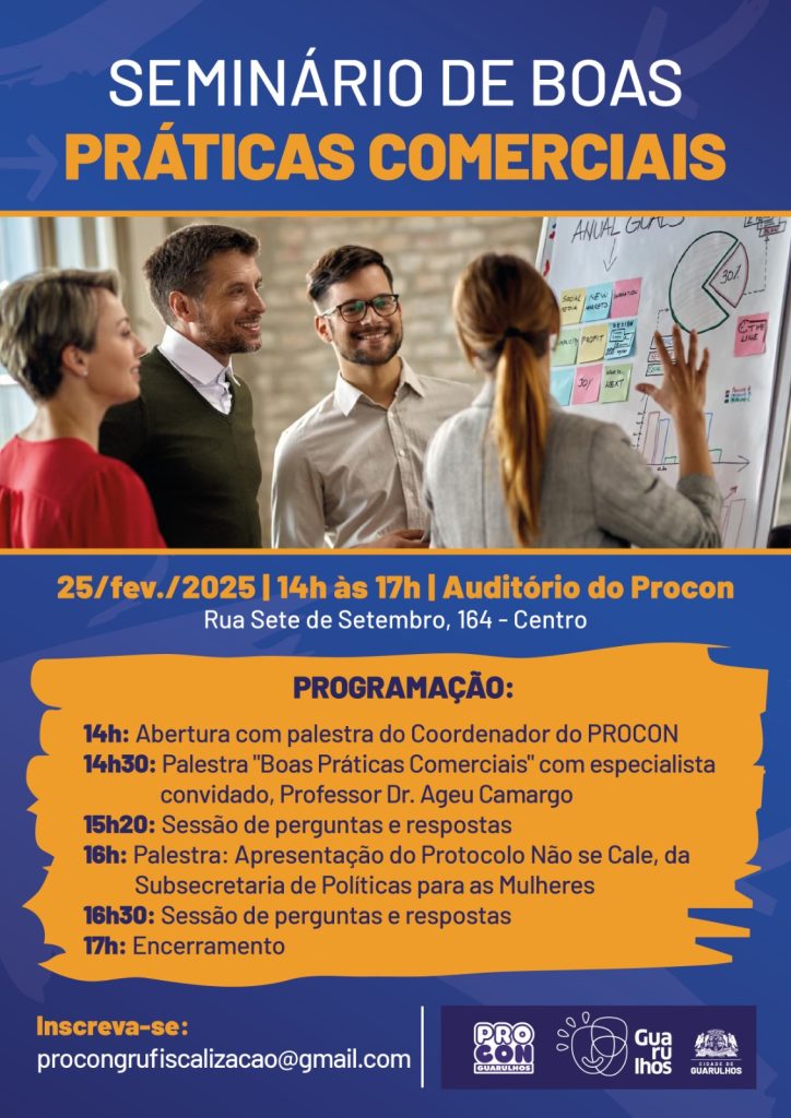 Com o objetivo de orientar os fornecedores a executarem práticas comerciais em conformidade com a lei 8.078/1990 (Código de Defesa do Consumidor), o Procon Guarulhos realizará na próxima terça-feira (25) o seminário Boas Práticas Comerciais, das 14h às 17h, no auditório em sua sede (rua Sete de Setembro, 164, Centro).