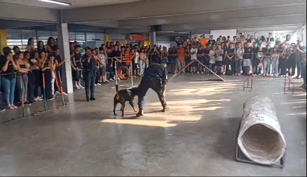 Brutus, um rottweiler, Hatchi, um pastor-belga-malinois, e Zoey, um pastor-alemão-preto, demonstraram obediência, destreza, agilidade e habilidades como faro e abordagens durante a condução dos profissionais. Um público de aproximadamente 600 pessoas, entre alunos do ensino médio, professores e coordenadores, assistiu e vibrou com as apresentações.