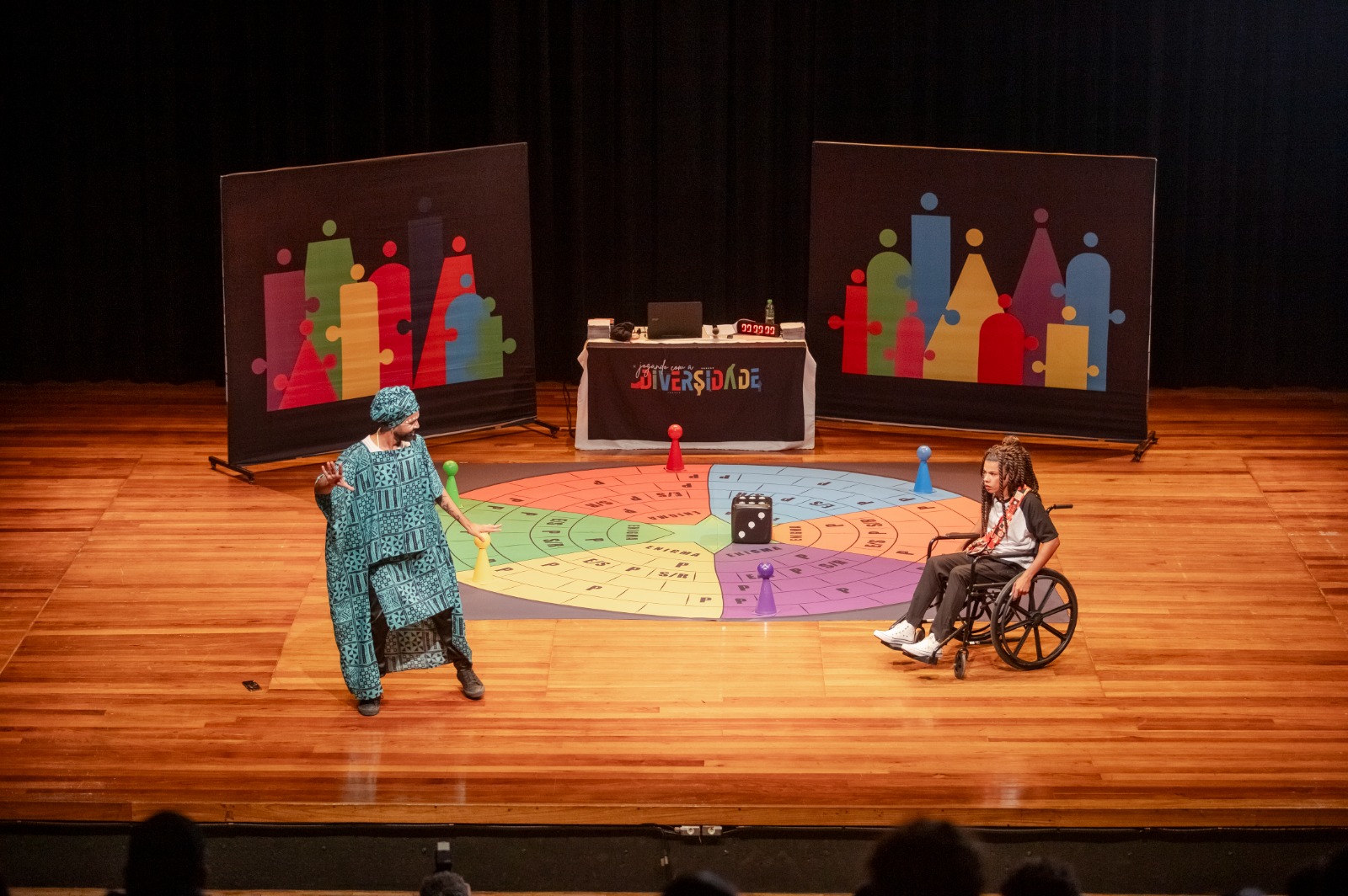 A apresentação se transforma em um emocionante jogo interativo com a plateia, com um tabuleiro enorme montado no chão. Os jovens, então, foram divididos em seis equipes, por cores e pinos. A cada jogada de dado os participantes avançavam e enfrentavam desafios, vibrando com as conquistas.