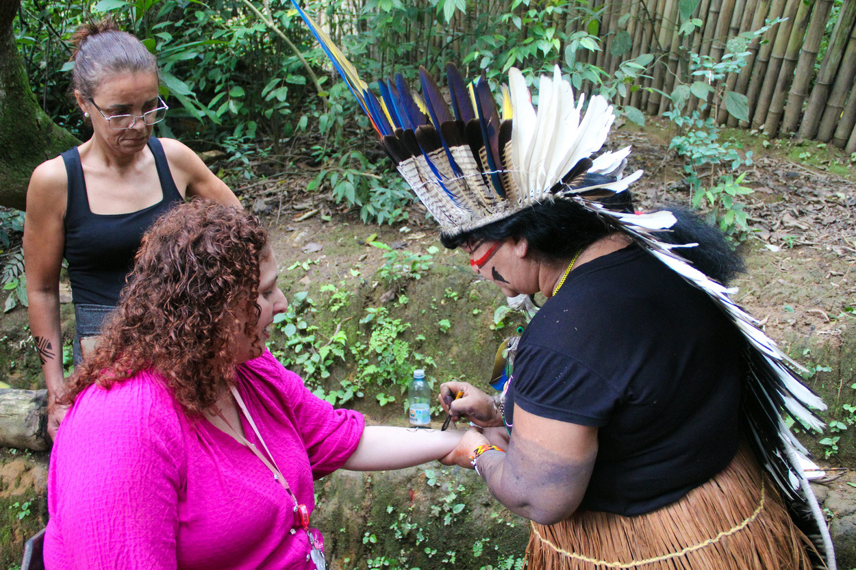 Durante a vivência, os educadores participaram de uma trilha guiada, assistiram palestra sobre a cultura indígena e se envolveram em atividades práticas como pintura corporal com carvão, jenipapo e urucum. Dentre os momentos impactantes, o grupo relatou que estar dentro de uma oca foi um momento de profunda conexão e escuta do conhecimento que circulou de forma oral, vivo e potente.