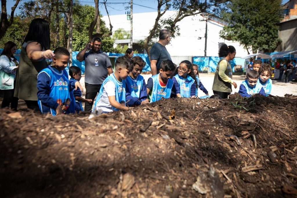 Alunos do 1º e 2º anos do ensino fundamental da EPG São Domingos, que participam das atividades do CEU no contraturno escolar, visitaram na manhã desta quinta-feira (8) o Pátio Escola de Compostagem e Agricultura Urbana, no Taboão. A visita é parte de uma série de atividades oferecidas pelo espaço durante a Semana da Compostagem 2025 com foco na educação ambiental.