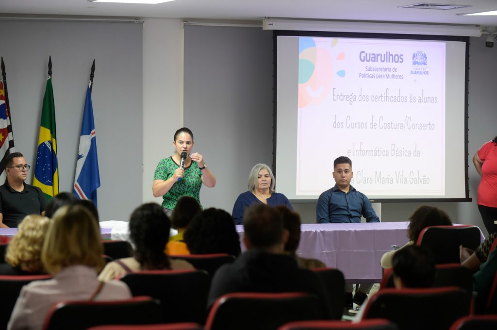 Em cerimônia realizada no auditório da Secretaria de Educação, um total de 52 mulheres recebeu nesta sexta-feira (9) certificados de conclusão de cursos de informática básica e de costura e conserto oferecidos pela Subsecretaria de Políticas para Mulheres na Casa da Mulher Clara Maria Vila Galvão. A entrega foi feita pela gestora da pasta, Vanessa de Jesus, acompanhada dos professores voluntários de informática, Gustavo Borges e Israel Anderson, e da professora voluntária de costura e conserto, Sandra Mendes.