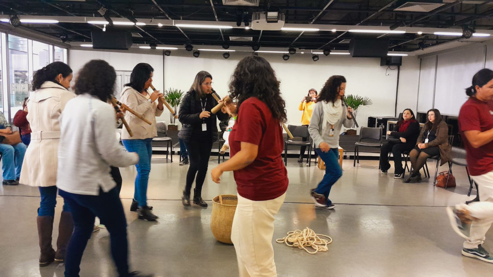 Nesta quinta-feira (29), gestores dos CEUs e espaços educacionais de Guarulhos participaram de atividade formativa com o grupo Kari, no auditório do Sesc Guarulhos. A ação, que integra a programação da Semana Mundial do Brincar, teve como objetivo proporcionar aos educadores um espaço de reflexão e de troca sobre a abordagem da cultura indígena no contexto escolar.