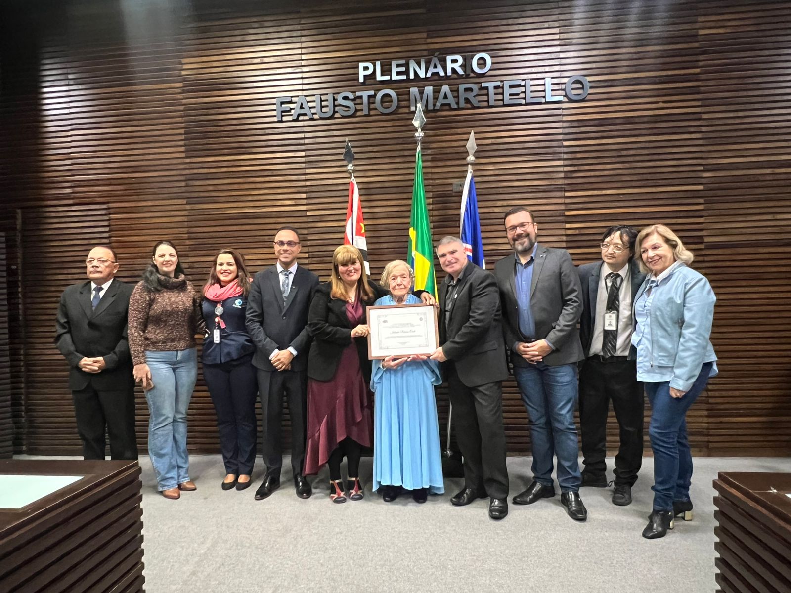 A aluna do primeiro semestre do curso de Nutrição da Universidade Guarulhos (UNG), dona Iolanda Ribeiro Conti, de 92 anos, foi homenageada em sessão solene na Câmara Municipal de Guarulhos. A moção honrosa foi concedida pelo vereador Daniel Santos e encheu o plenário de autoridades, professores, familiares e estudantes que foram prestigiar a futura nutricionista.