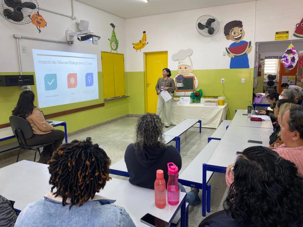 Mediado pela vice-diretora Maria Alvani Martes, o encontro apontou impactos negativos no uso excessivo de telas, como a redução da atenção e da concentração, atrasos na linguagem, especialmente em crianças pequenas, dificuldades para dormir, aumento da irritabilidade, isolamento social e menor interesse por brincadeiras livres.