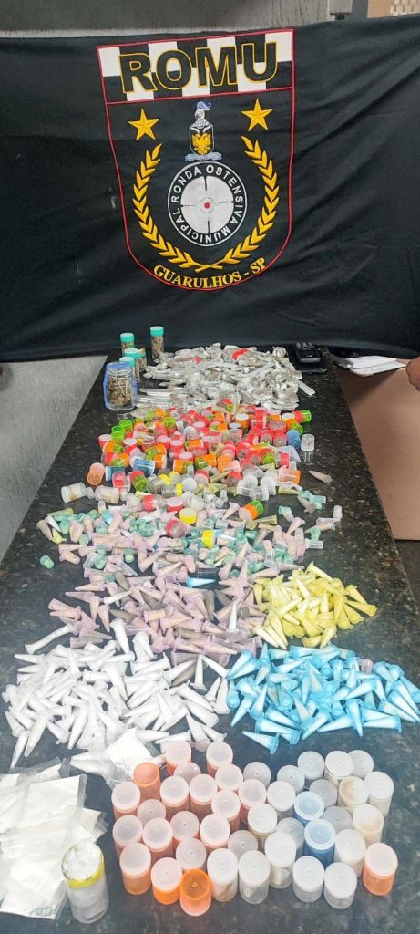 Agentes da Ronda Ostensiva (Romu) da Guarda Civil Municipal (GCM) de Guarulhos prenderam um traficante no sábado (12) e apreenderam 935 porções de entorpecentes no Parque Continental 1.
