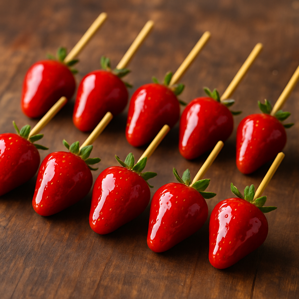Trata-se de uma oficina sobre o preparo de uma receita que combina morangos frescos encapados com um brigadeiro branco e coberto com uma calda vermelha caramelizada de açúcar como a das tradicionais maçãs do amor.