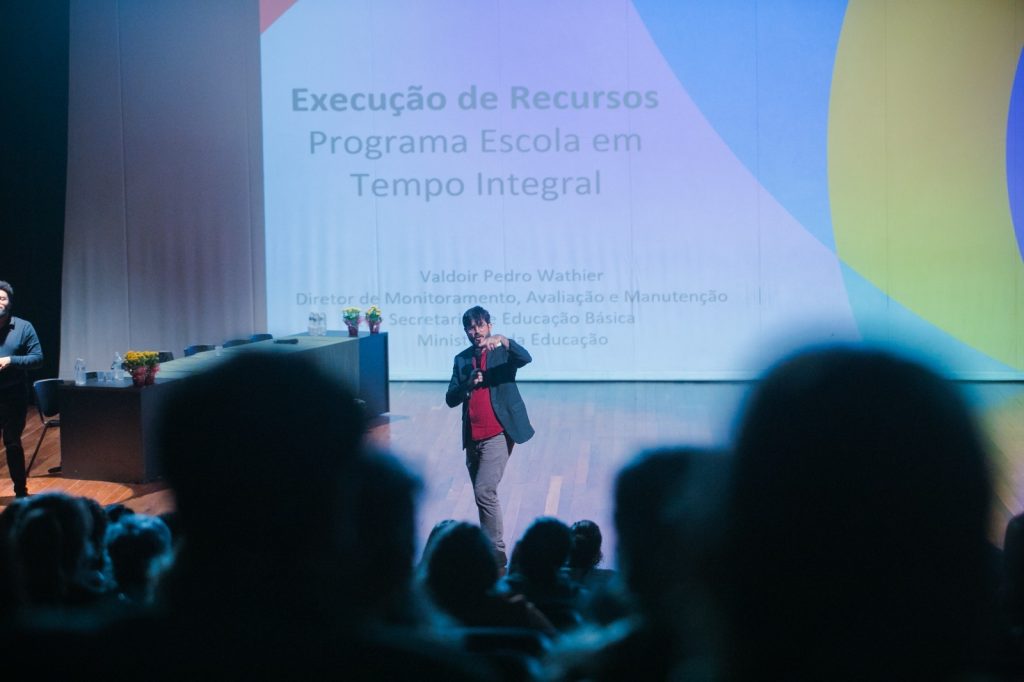 O encontro ocorreu no Centro Municipal de Educação Adamastor e contou com a palestra Educação em Tempo Integral: Fontes, Desafios e Perspectivas de Financiamento, ministrada por Valdoir Pedro Wathier, diretor da Secretaria de Educação Básica (SEB) do MEC.