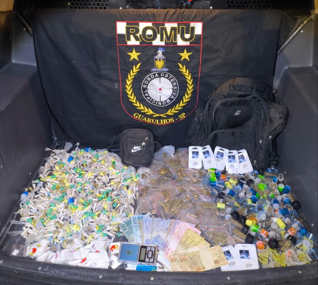 A Guarda Civil Municipal (GCM) de Guarulhos prendeu na noite de terça-feira (26) um traficante com 3,6 kg de entorpecentes no Jardim Irene. Agentes da Ronda Ostensiva (Romu) patrulhavam a rua Maria Antonieta quando abordaram o criminoso, que tentou fugir ao avistar a viatura. Ele carregava uma sacola e uma mochila com 873 porções de cocaína e 371 de maconha.