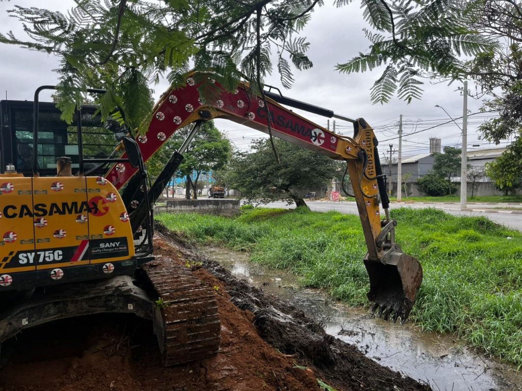Uma escavadeira hidráulica é utilizada no desassoreamento. O equipamento realiza a remoção de resíduos e detritos acumulados no leito do córrego, o que permitirá um aumento na vazão e na fluidez das águas. A ação prevê também o alargamento das margens do local.