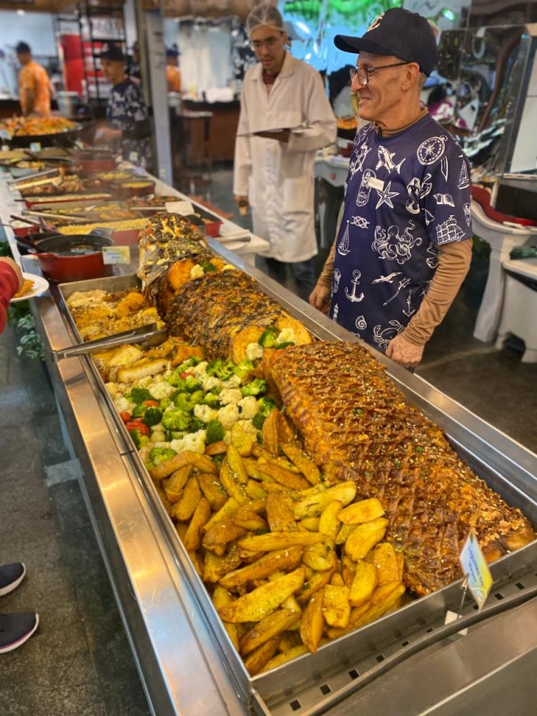 Em seguida, já no salão, pode se deliciar com um buffet completo de pratos frios, como Ceviche Clássico Peruano, Ceviche de Mexilhões, Salada de Lulas Nacional com Batatas, Mariscos ao Molho Pesto, Salpicão de Frutos do Mar, Sardinha com Cuscuz Marroquino, Sushi de Salmão, Salada de Bacalhau com Grão de bico, Salada de Arroz Negro com Lula, Tomate recheado com Atum Temperado entre outros.