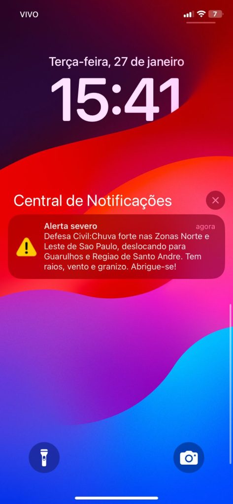 A Defesa Civil emitiu um alerta severo nesta terça (27) para Guarulhos diante da previsão de chuva forte, acompanhada de raios, vento e granizo. O aviso indica que o temporal atinge as Zonas Norte e Leste de São Paulo e se desloca em direção a Guarulhos, avançando também para a região de Santo André.
