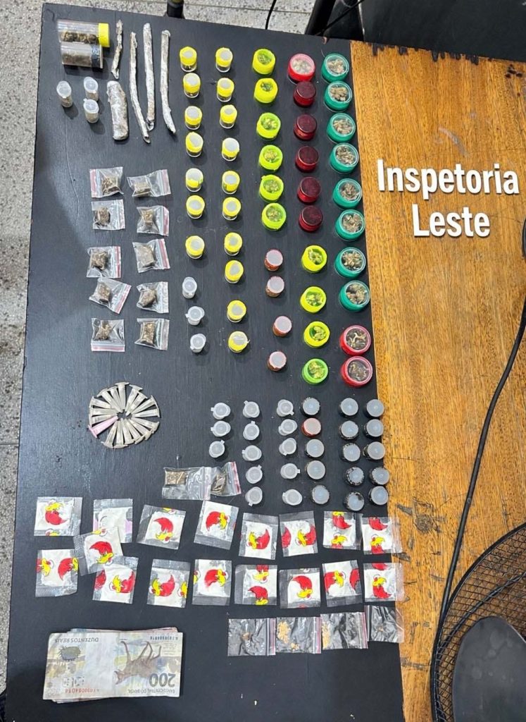 A equipe da Inspetoria Leste localizou o criminoso em área invadida na rua da Pátria. Com ele, foram apreendidas 100 porções de maconha, 37 de cocaína, dois celulares e R$ 270.