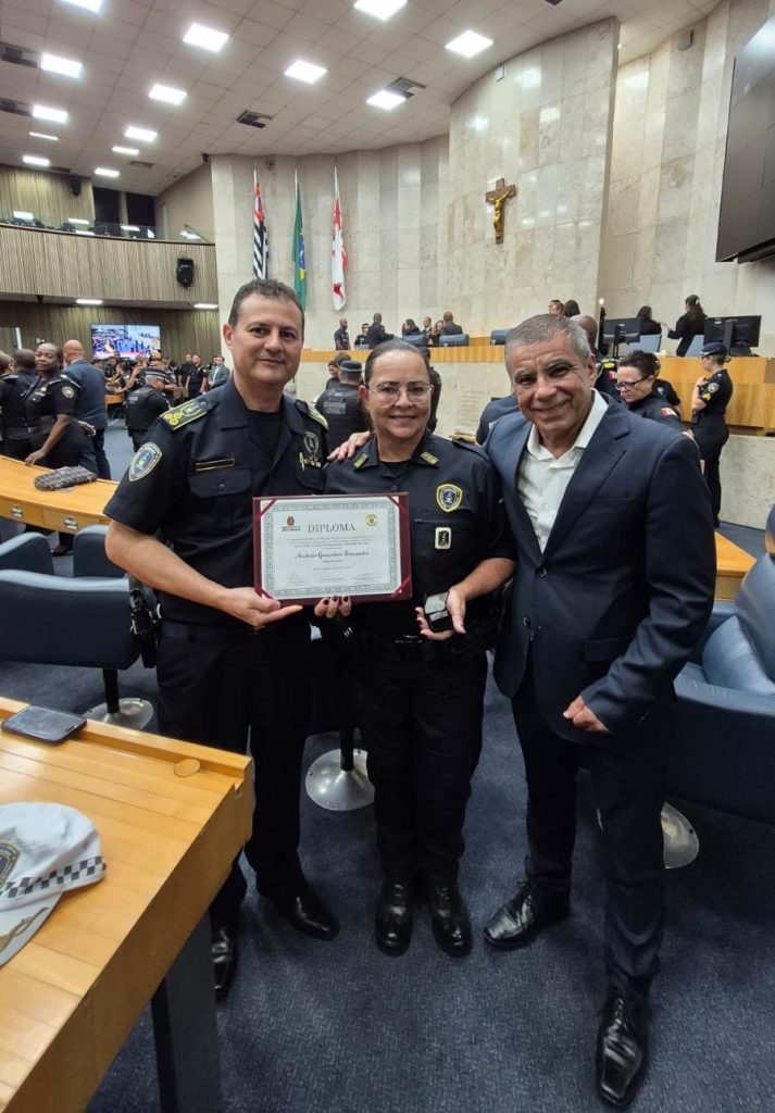 As mulheres da Guarda Civil Municipal (GCM) de Guarulhos foram representadas pela inspetora Andréia Gonçalves Fernandes em sessão solene na Câmara Municipal de São Paulo, na segunda-feira (6). Integrante da primeira turma feminina da corporação, ela atua como inspetora-geral e comanda a Inspetoria de Trânsito.