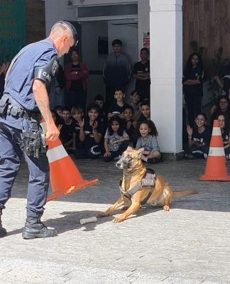 Durante a ação, os cães treinados para atuar em ocorrências como localização de pessoas e entorpecentes, mostraram técnica, disciplina e interação com o público, proporcionando aprendizado e momentos de descontração aos estudantes.