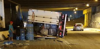 Após 17 horas, caminhão tombado é retirado do Trevo de Bonsucesso