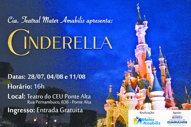 Nos dias 4 e 11 de agosto, sábados, às 16h, o Teatro Ponte Alta apresenta o espetáculo teatral Cinderela, uma iniciativa do Colégio Mater...