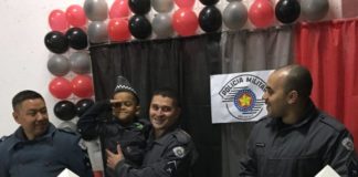 Policiais militares do 15° Batalhão realizaram uma festa de aniversário surpresa para uma criança que completava sete anos de nome Renan Lacerda, no bairro...