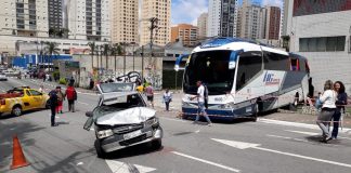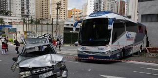 Ônibus desgovernado desce de ré, bate em 5 carros e mata...