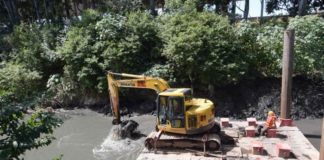 Uma escavadeira hidráulica, operando em plataforma embarcada , começou a ser usada no desassoreamento do rio Baquirivu-Guaçu